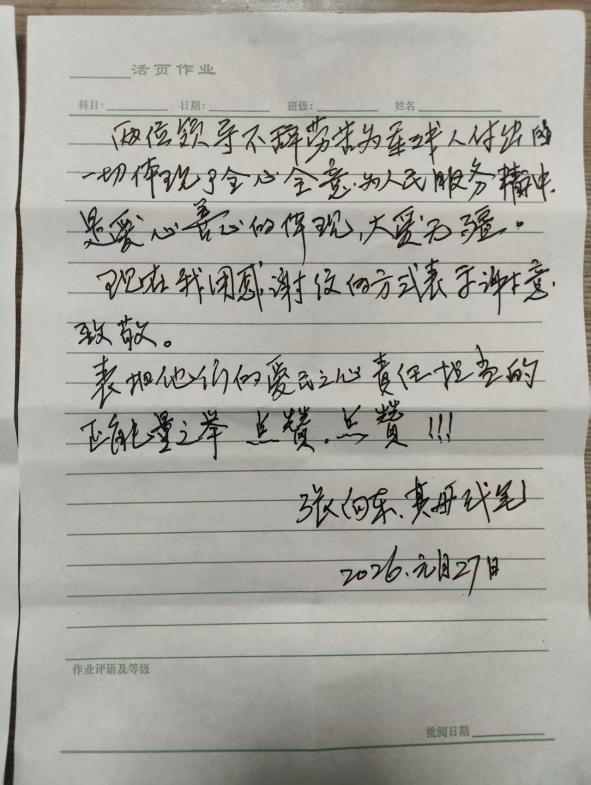 從入戶的故障排查、管道清洗、密封窗戶到贈送生活物資,王強強和胡紅娜的每一個舉動,都被張向東看在眼里、記在心里。因無法用言語清晰表達感激,他特意拜托母親代筆,寫下這封感謝信,為熱力“貼心人”點贊。王強強和胡紅娜表示,他們將繼續(xù)關(guān)注轄區(qū)內(nèi)的孤寡老人、殘障人士等特殊群體,并列為供熱運行重點服務(wù)對象,供暖期定期上門回訪,用貼心、暖心的服務(wù),把溫暖送到每一位群眾的心坎上。
