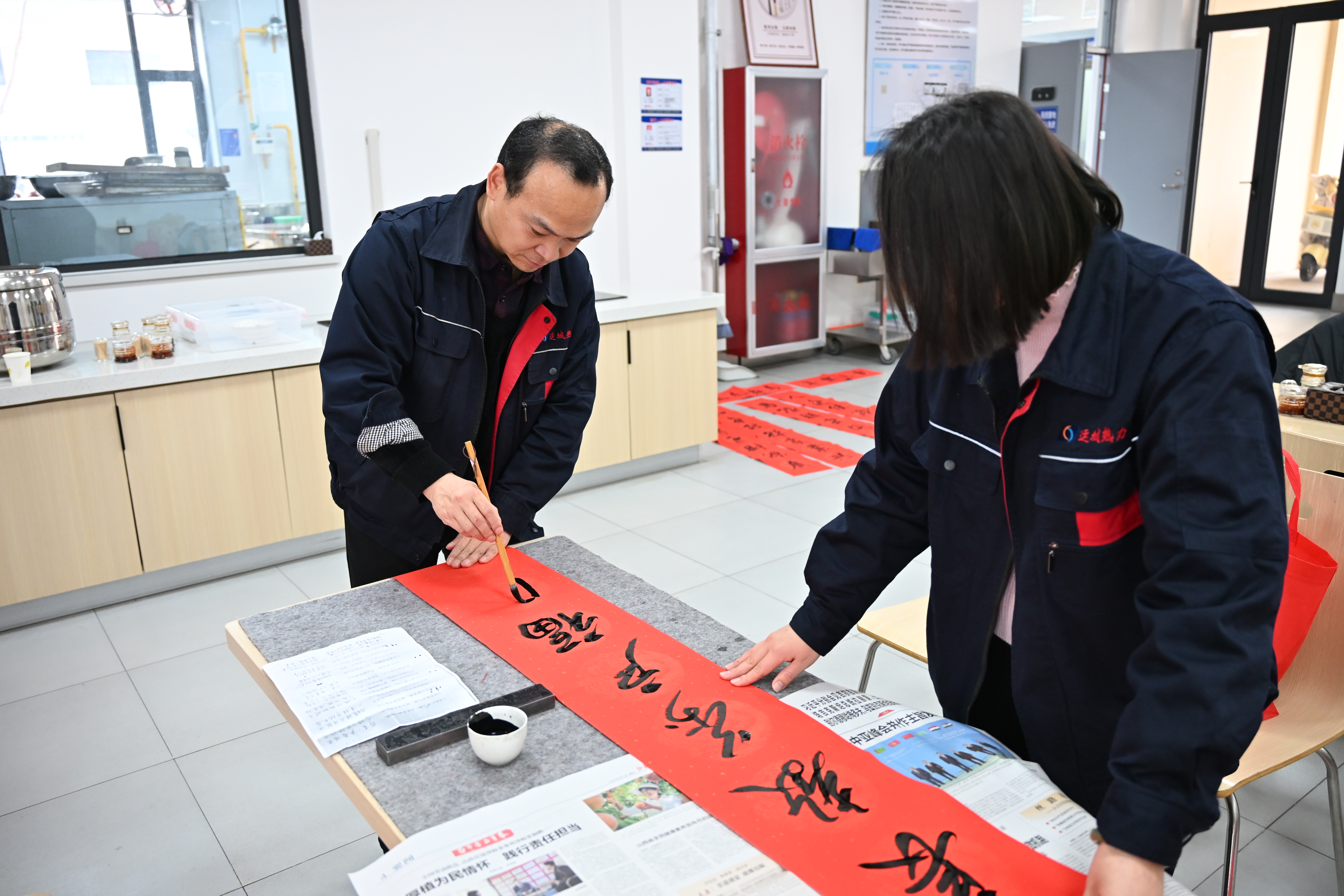 活動(dòng)現(xiàn)場(chǎng)熱鬧非凡,職工們或圍站案前凝神欣賞書法創(chuàng)作,或仔細(xì)挑選心儀的春聯(lián)內(nèi)容,或主動(dòng)與書法家交流定制專屬祝福,歡聲笑語(yǔ)不斷。拿到春聯(lián)的職工們小心翼翼地捧著墨跡未干的作品,臉上洋溢著幸福的笑容,紛紛表示:“手寫的春聯(lián)最有年味兒,不僅字寫得漂亮,內(nèi)容也貼合我們熱力人的工作,帶著這份祝;丶疫^(guò)年,心里特別暖!”大家相互展示著領(lǐng)到的春聯(lián),交流著對(duì)新年的期盼,紅色的春聯(lián)與燦爛的笑容相映成趣,讓整個(gè)會(huì)議室充滿了溫馨祥和的氛圍。