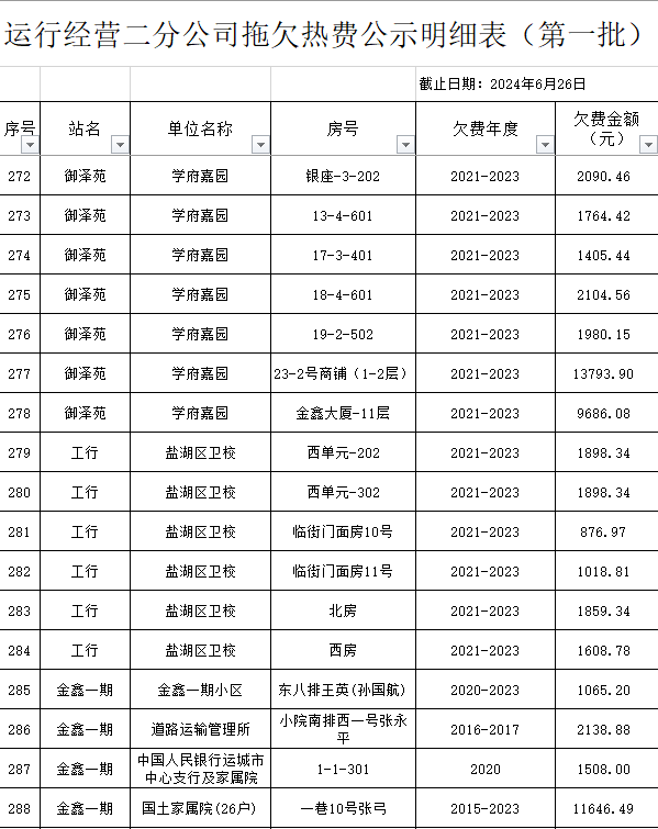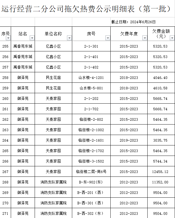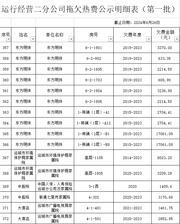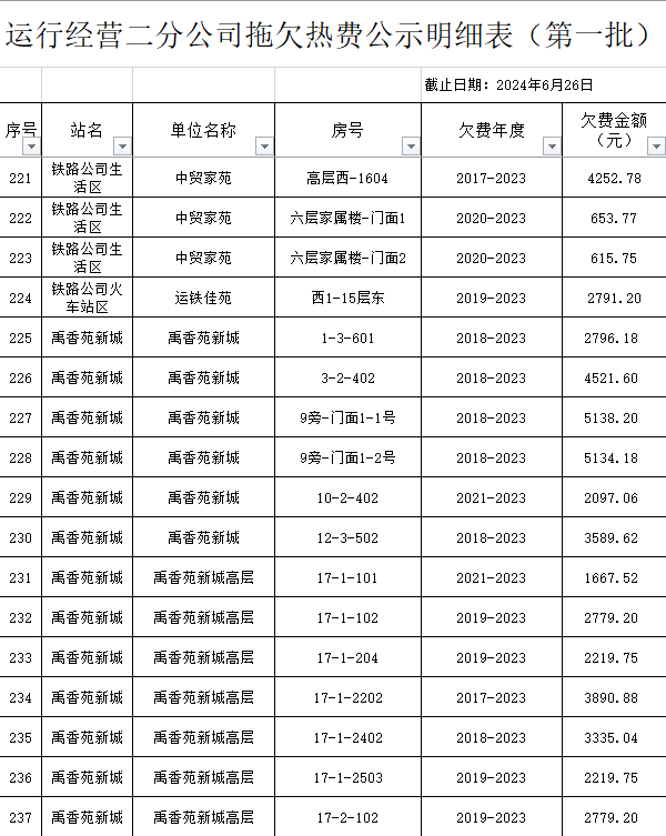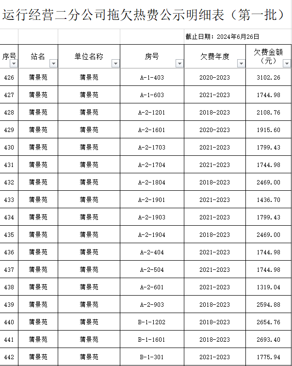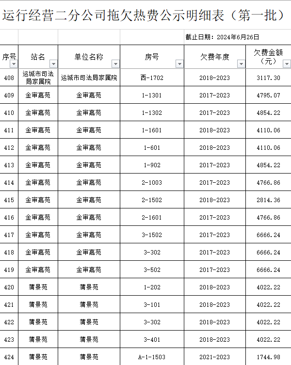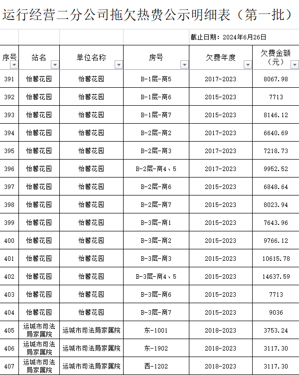 根據(jù)《運城市中心城區(qū)集中供熱管理暫行辦法》第二十五條及運價管字【2009】199號《關(guān)于明確集中供熱收費有關(guān)問題的通知》第一項“城市供熱實行繳費用熱的原則”,截至目前,仍有部分用戶未繳納2023年度及以前年度熱費,直接影響了供熱企業(yè)正常生產(chǎn)運行。為了加快欠費回籠,確保供熱企業(yè)生產(chǎn)運行,請下列欠費的用戶,在2024年10月30日之前交清拖欠熱費。否則,供熱企業(yè)有權(quán)依法維護自身權(quán)益,拖欠用戶將承擔(dān)相應(yīng)的責(zé)任和由此造成的一切后果。也通過媒體公示,讓社會監(jiān)督,讓我們共同行動,共同營造良好供熱運營環(huán)境和氛圍,為廣大居民溫暖過冬發(fā)揮各自應(yīng)有的作用。