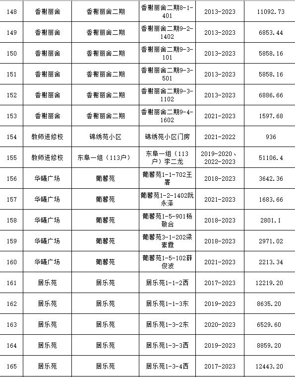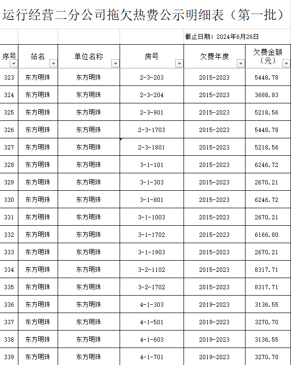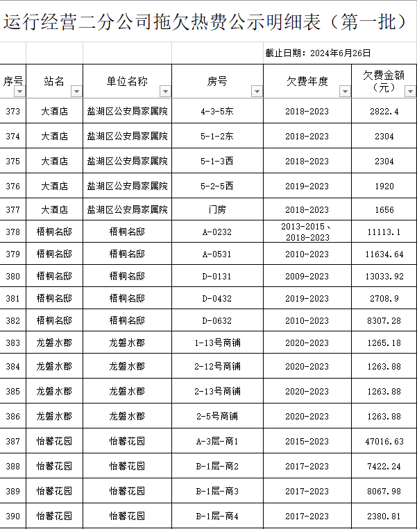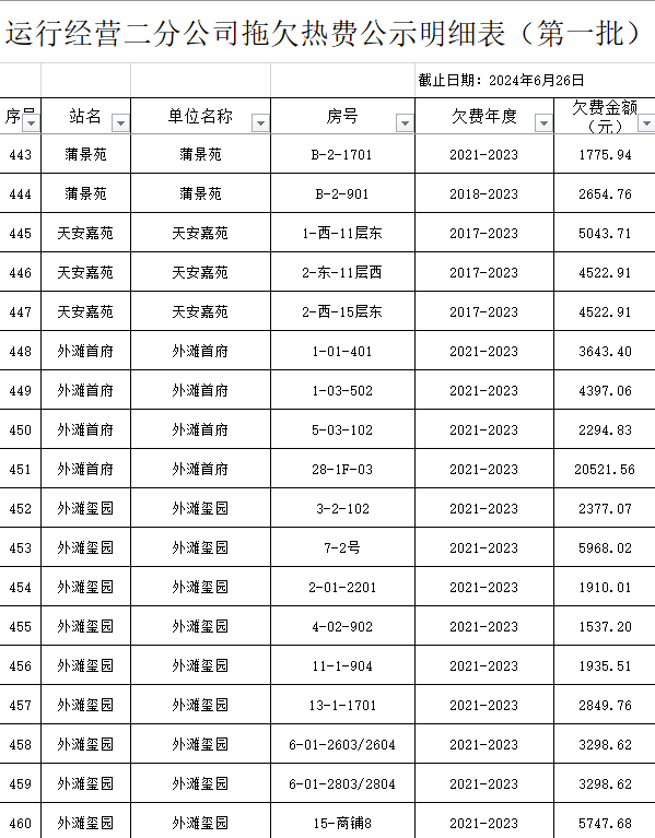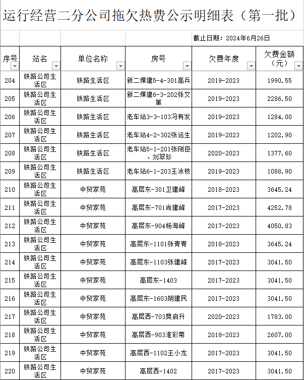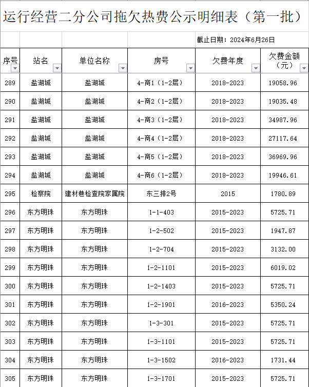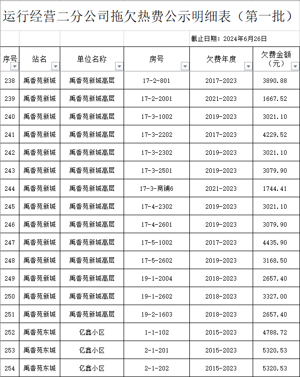 根據(jù)《運城市中心城區(qū)集中供熱管理暫行辦法》第二十五條及運價管字【2009】199號《關(guān)于明確集中供熱收費有關(guān)問題的通知》第一項“城市供熱實行繳費用熱的原則”,截至目前,仍有部分用戶未繳納2023年度及以前年度熱費,直接影響了供熱企業(yè)正常生產(chǎn)運行。為了加快欠費回籠,確保供熱企業(yè)生產(chǎn)運行,請下列欠費的用戶,在2024年10月30日之前交清拖欠熱費。否則,供熱企業(yè)有權(quán)依法維護自身權(quán)益,拖欠用戶將承擔(dān)相應(yīng)的責(zé)任和由此造成的一切后果。也通過媒體公示,讓社會監(jiān)督,讓我們共同行動,共同營造良好供熱運營環(huán)境和氛圍,為廣大居民溫暖過冬發(fā)揮各自應(yīng)有的作用。