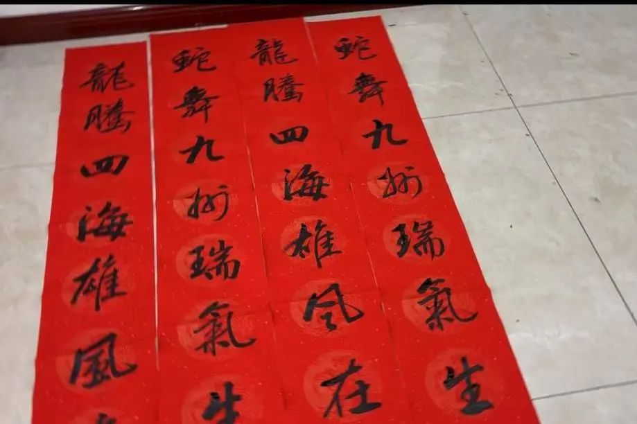 活動現(xiàn)場氣氛火熱,墨香撲鼻,五張方桌“L”形排開,書法家們揮毫運墨,隨著他們筆鋒的轉(zhuǎn)動,一副副對聯(lián)、“福”字寓意吉祥的春聯(lián)躍然紙上,書寫出辭舊迎新的美好前景。“龍騰已是清新地;蛇舞又將明媚天。紫燕歸巢春有約;金蛇賀歲福無邊。賀歲當(dāng)邀新燕舞;點睛試看小龍飛。銀蛇起舞開春序;紫燕飛歌奏福音。蛇盤福字千家滿;蝶變春風(fēng)萬里新。小龍接福呼春至;大夢催人拓業(yè)忙。”