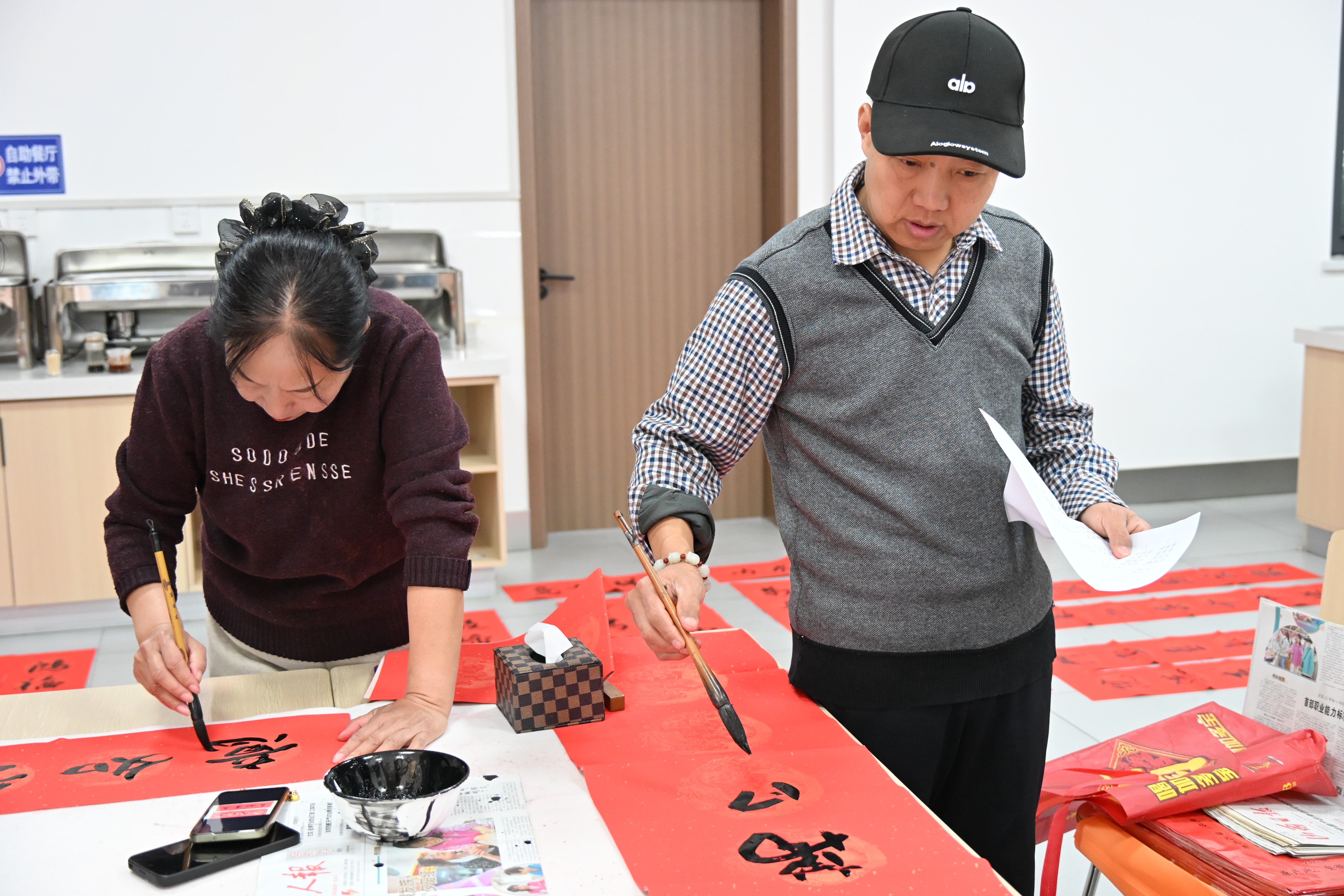一張張鋪展的大紅宣紙整齊排列,筆墨硯臺(tái)一一就位,書法家們凝神聚氣,揮毫潑墨間筆走龍蛇?瑫饲f大氣,行書流暢飄逸,隸書古樸厚重,各具特色的書法風(fēng)格將馬年吉祥寓意與熱力人堅(jiān)守奉獻(xiàn)的職業(yè)精神巧妙融合。“金馬踏春輸暖韻,初心筑夢(mèng)惠民生”“騁馬揚(yáng)鞭興熱力,春風(fēng)送暖入千家”“福滿熱力全家福,春歸河?xùn)|萬(wàn)象新”,一副副對(duì)仗工整、寓意深遠(yuǎn)的春聯(lián)躍然紙上,既飽含著對(duì)新年的美好期許,也彰顯著運(yùn)城熱力服務(wù)民生、溫暖萬(wàn)家的責(zé)任擔(dān)當(dāng)。一個(gè)個(gè)飽滿圓潤(rùn)的“福”字,筆力遒勁、喜氣盎然,將新春的祝福與滿滿的暖意凝于筆端、落于紙上。